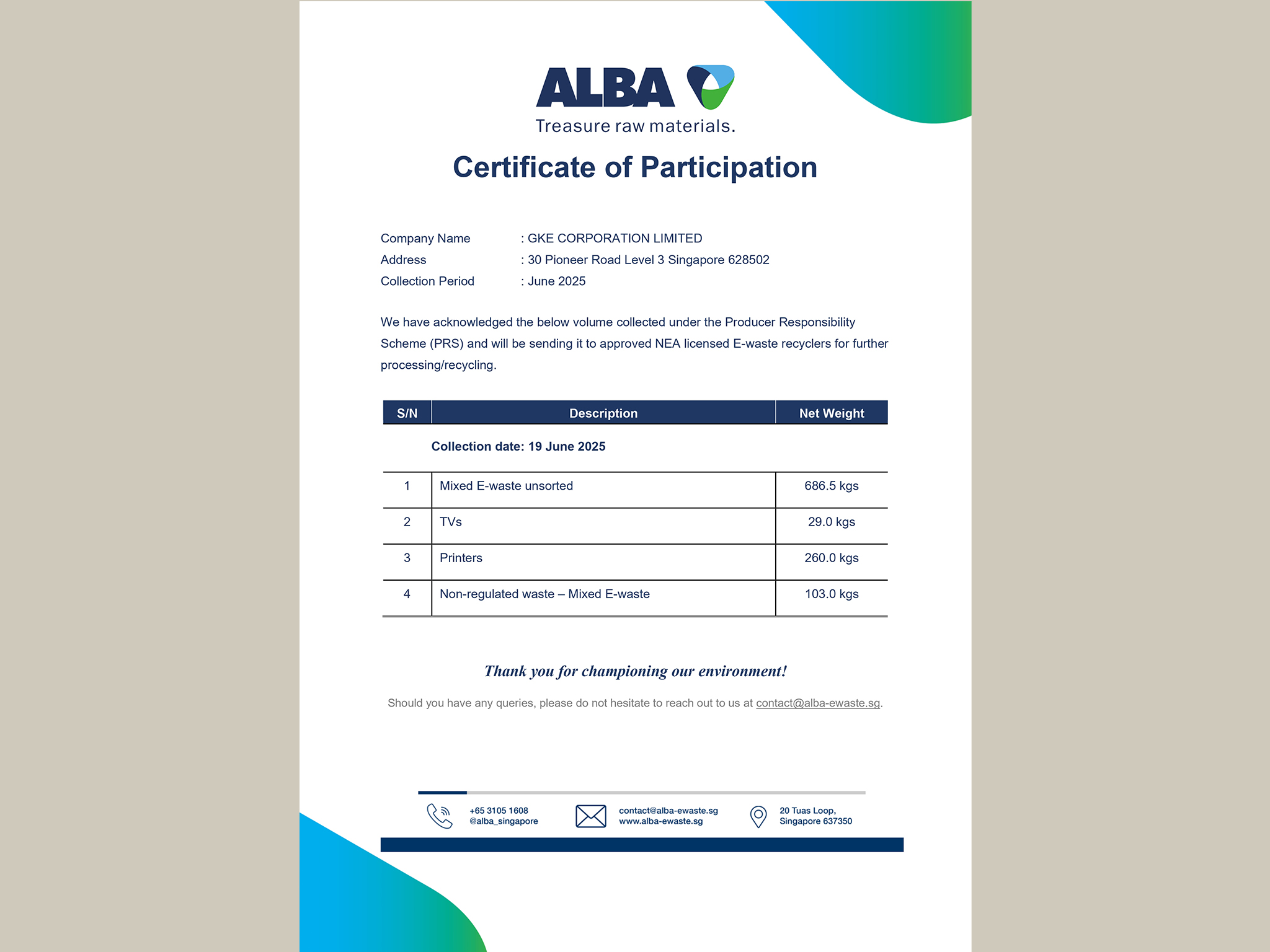 As part of our commitment to environmental sustainability, GKE is supporting e-waste recycling efforts through our partnership with ALBA E-Waste Singapore. By participating in ALBA’s nationwide e-waste recycling program, we are helping to reduce the environmental impact of electronic waste by encouraging the proper disposal and recycling of old or unused electronics. E-waste recycling bins are placed across various GKE buildings during the collection period. This initiative raises awareness among employees and stakeholders about the importance of proper e-waste management. We have collected approximately 1078kg worth of electronic items, including monitors, laptops, printers, mobile phones, televisions, tablets by the end of June 2025. Taking meaningful action for sustainability – that’s #GKECares!